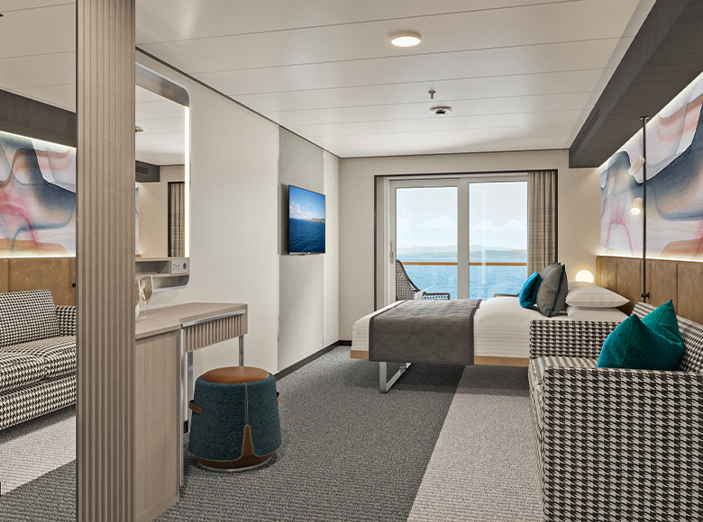 Designed to blend both indoor and outdoor experiences with stunning views of the ocean through grandiose floor-to-ceiling windows for panoramic views from the ship’s bow.