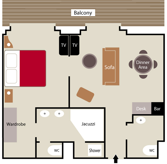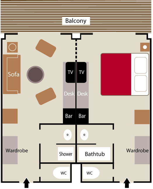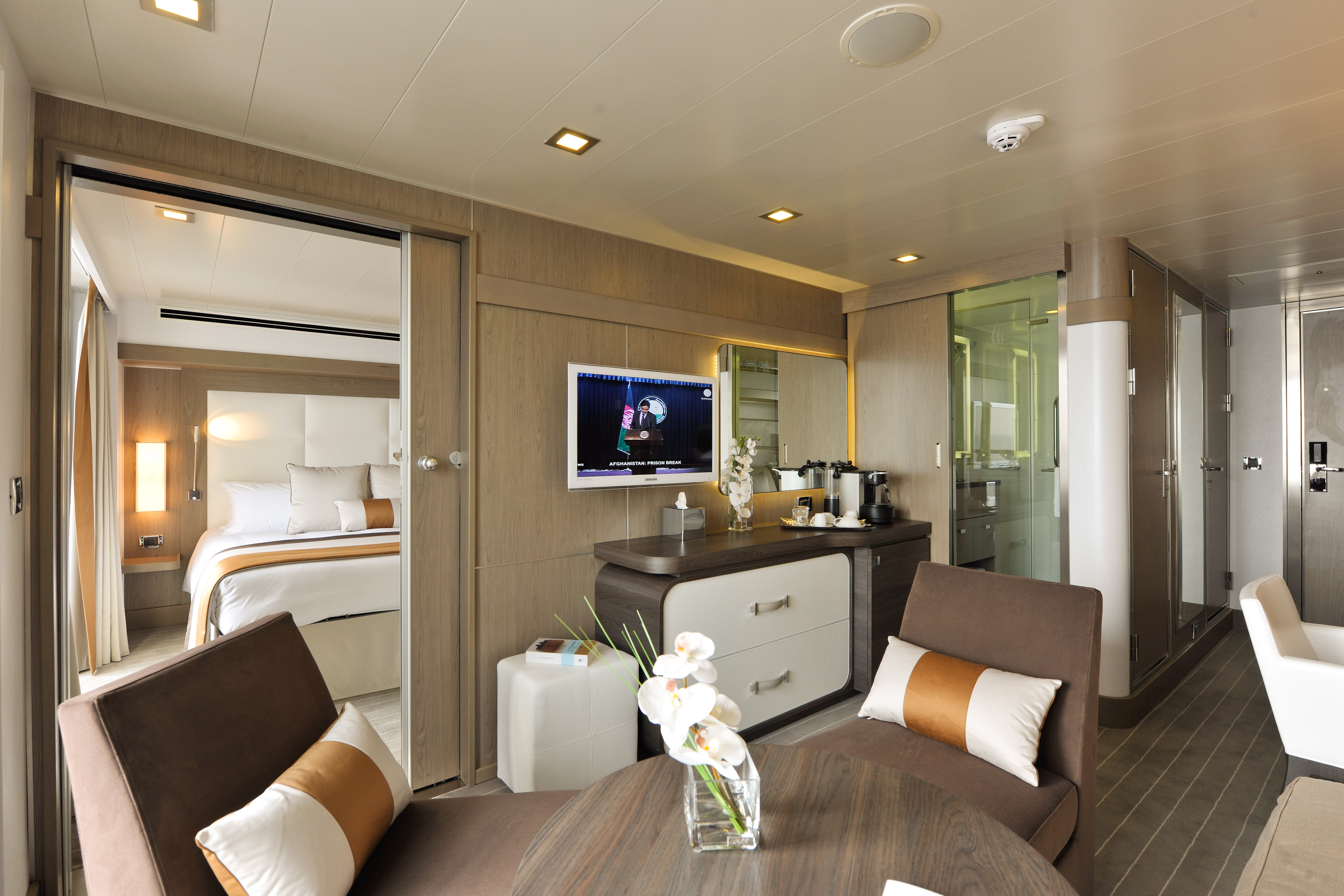 Luxury Suites feature a bedroom with a king-size bed or twin beds, a TV, and a dressing with table and hairdryer. The living room has sofa, minibar, flat screen TV, iPod players, desk with stationery, and a satellite direct line telephone. There are two bathrooms, one with a bath, the other with a shower, each feature French bath products and bath robes.Butler service is provided for passengers staying in suites, offering a tailor-made and trouble-free cruise. Attentive and discreet, the Butler will be a main point of contact, providing personalised daily service and meeting all desires efficiently and discreetly.The suite also benefits from individually-controlled air-conditioning, 24h room service, WiFi and a 86 Sq. ft Balcony.